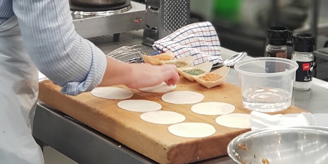 - Spoon the filling 2 inches apart on the water washed half and gently fold over the other half of the dough. Trim edges and fold over again